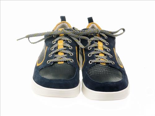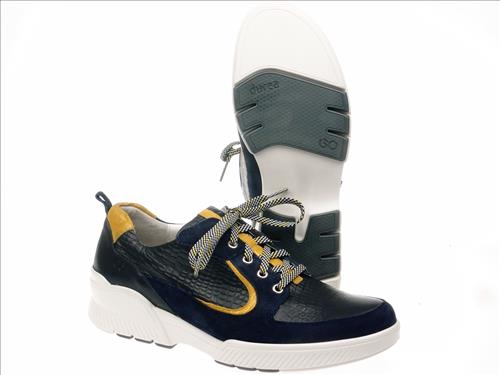Durea 6232 GO veterschoen in donkerblauw/oker leer. Deze schoenen zijn verkrijgbaar vanaf maat 37. Durea is een merk waarbij vakmanschap centraal staat. Doordat Durea het hele productieproces in eigen beheer heeft, bent u ook verzekerd van de beste kwaliteit wanneer u Durea schoenen koopt. Dit geldt zowel voor de sandalen als voor de sneakers, maar ook voor de enkellaarsjes en pumps of ballerina’s. Al deze schoenen hebben een comfortabele pasvorm waardoor ze lekker lopen. Daarnaast is er bij elke schoen oog voor de uitstraling, zodat de schoenen van Durea er altijd mooi uitzien. Het motto van Durea is ‘’uit liefde voor je voeten’’ en dat merk je aan alles. Zo wordt er bij Durea schoenen rekening gehouden met de breedte van uw voet.