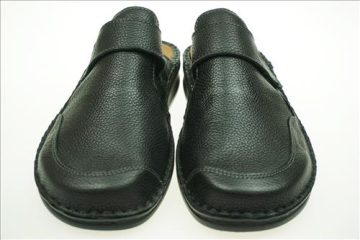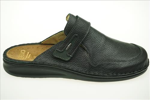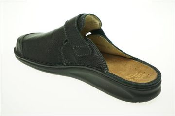 Fidelio slipper in zwart leer met verstelbare sluiting. Deze slippers zijn op voorraad vanaf maat 41.