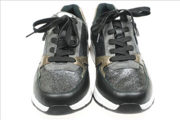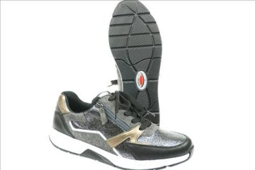 Gabor Rolling Soft sneaker in zwart/metallic grijs/brons leer. Deze schoenen zijn op voorraad vanaf maat 37.