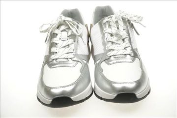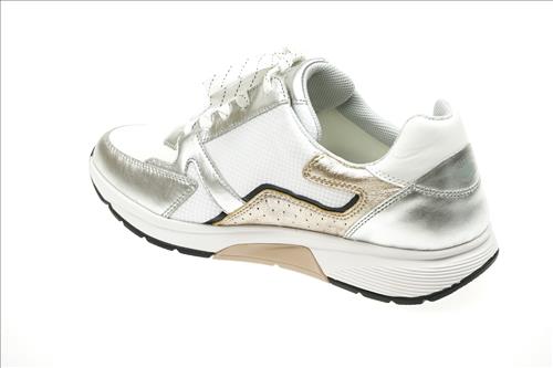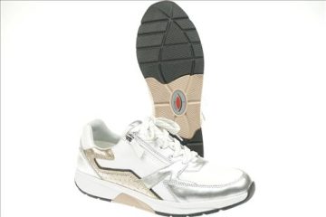 Gabor Rolling Soft sneaker in wit/zilver/brons leer. Deze schoenen zijn op voorraad vanaf maat 37.