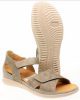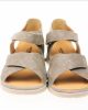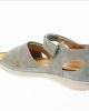 Hartjes sandaal in taupe leer met dichte hiel en verstelbare sluiting.