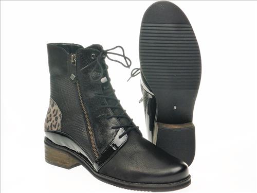 Helioform veterlaarsje in zwart/animal print leer. Helioform produceert damesschoenen van hoge kwaliteit met een uitstekend draagcomfort. Het doel van Helioform is om voor iedere vrouw perfect passende schoenen te ontwerpen die comfortabel lopen maar er ook mooi uitzien. De damesschoenen zijn daardoor verkrijgbaar in verschillende breedtematen. En alle modellen zijn voorzien van een uitneembaar voetbed waardoor ze eventueel geschikt zijn voor eigen steunzolen. Zo ben je altijd verzekerd van een goede pasvorm.