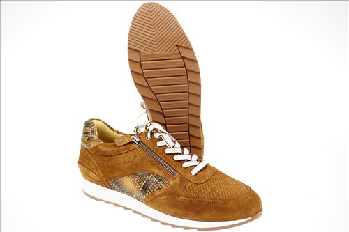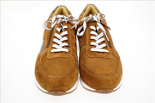 Helioform sneaker in cognac geprint suede. Helioform produceert damesschoenen van hoge kwaliteit met een uitstekend draagcomfort. Het doel van Helioform is om voor iedere vrouw perfect passende schoenen te ontwerpen die comfortabel lopen maar er ook mooi uitzien. De damesschoenen zijn daardoor verkrijgbaar in verschillende breedtematen. En alle modellen zijn voorzien van een uitneembaar voetbed waardoor ze eventueel geschikt zijn voor eigen steunzolen. Zo ben je altijd verzekerd van een goede pasvorm.