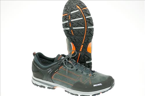 Meindl Ontario GTX wandelschoen in grijs/oranje suede. Deze schoenen zijn verkrijgbaar vanaf maat 42. Maat 42 t/m 46 € 189,95.