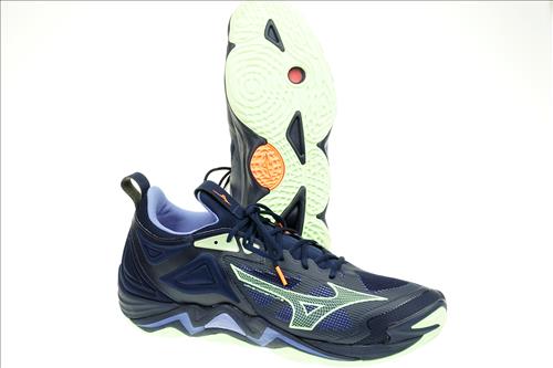 Mizuno Wave Momentum 3  indoorschoen in blauw/mintgroen.