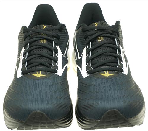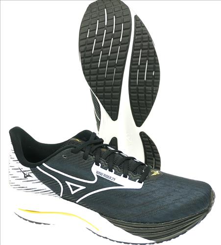 Mizuno Wave Rider 29 hardloopschoen in donkerblauw/wit/goud combinatie.