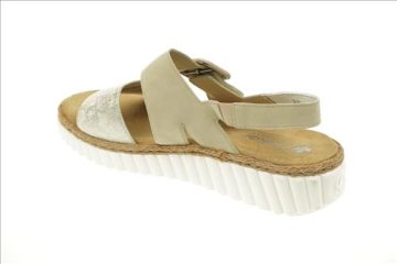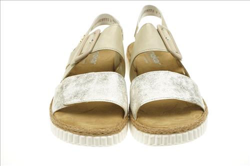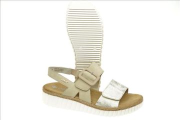 Rieker sandaal in beige/brons met verstelbare sluiting. Deze sandalen zijn op voorraad vanaf maat 37.