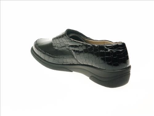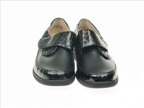 Solidus Hedda klittebandschoen in zwart/crocolak leer met uitneembaar voetbed in wijdte K. Extra breed.Geschikt voor reuma en diabetes voeten. Solidus comfortschoenen zijn gemaakt van zachte, comfortabele materialen die zorgen voor een perfecte drukverdeling. Ook zijn er elastische materialen in de schoenen van Solidus verwerkt, zodat knellende schoenen verleden tijd zijn. Het voetbed van alle Solidus schoenen is daarnaast anatomisch gevormd en uitneembaar, zodat ze ook geschikt zijn om uw eigen steunzolen in te plaatsen. Naast comfort, staat een trendy look bij Solidus hoog in het vaandel. Solidus schoenen zijn dan ook zowel comfortabel als trendy.