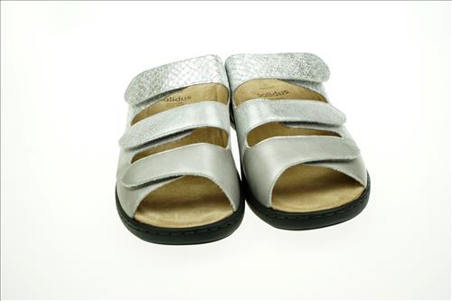 Solidus slipper in zilver leer met verstelbare sluiting. Solidus comfortschoenen zijn gemaakt van zachte, comfortabele materialen die zorgen voor een perfecte drukverdeling. Ook zijn er elastische materialen in de schoenen van Solidus verwerkt, zodat knellende schoenen verleden tijd zijn. Het voetbed van alle Solidus schoenen is daarnaast anatomisch gevormd en uitneembaar, zodat ze ook geschikt zijn om uw eigen steunzolen in te plaatsen. Naast comfort, staat een trendy look bij Solidus hoog in het vaandel. Solidus schoenen zijn dan ook zowel comfortabel als trendy.